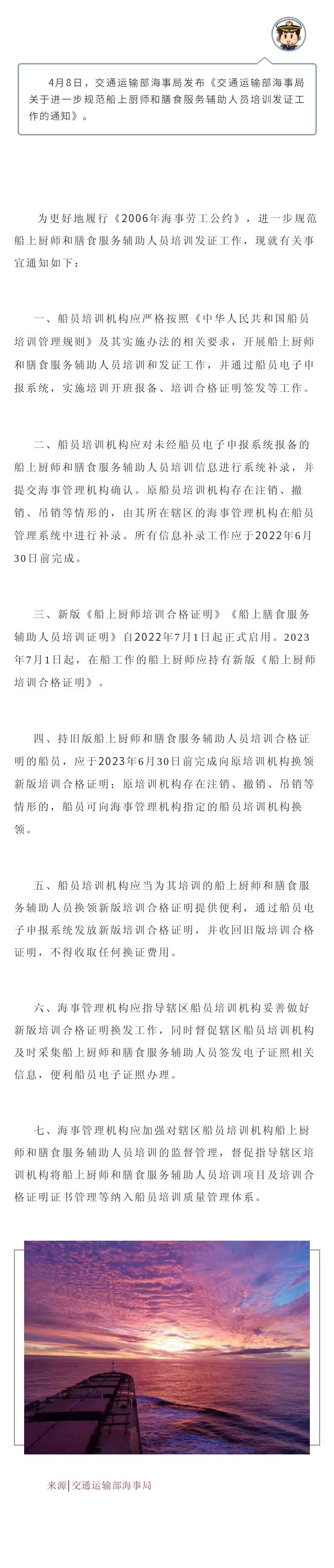 【最新政策】交通運輸部海事局關(guān)于進(jìn)一步規(guī)范船上廚師和膳食服務(wù)輔助人員培訓(xùn)發(fā)證工作的通知